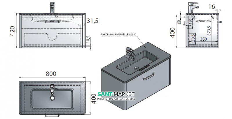 1) Раковина Annabelle 800, выдвижной ящик с системой Soft Close