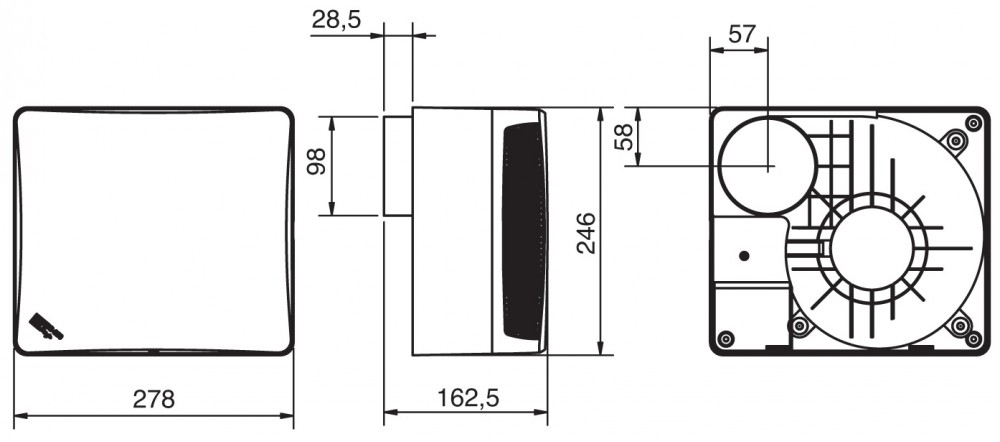 H - модель оснащена гигростатом, вентилятор переходит на максимальную производительность по сигналу гигростата или по внешнему выключателю (работает совместно с таймером).