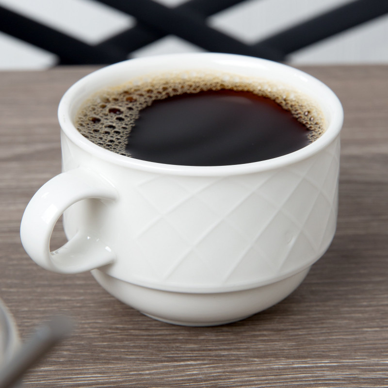 Этот предмет свежего белого цвета является профессиональным и привлекательным решением для сервировки вашего ресторана, отеля или обеденного зала загородного клуба. Его простой силуэт и цвет создают контраст, позволяя вашим ярким свежим блюдам стать центральным элементом любой обеденной зоны. Используйте эту штабелируемую чашку для подачи чая, кофе и горячего шоколада. Этот предмет украшен привлекательным перекрещивающимся узором, который обеспечивает тонкую и элегантную детализацию, добавляя визуального интереса к вашей настольной презентации. Подавайте его отдельно или сочетайте это изделие с остальной частью коллекции Bella для привлекательной и профессиональной презентации.