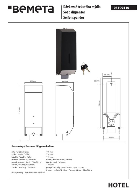 Диспенсер для жидкого мыла Bemeta Hotel 1100 мл нержавеющая сталь черный матовый 105109410