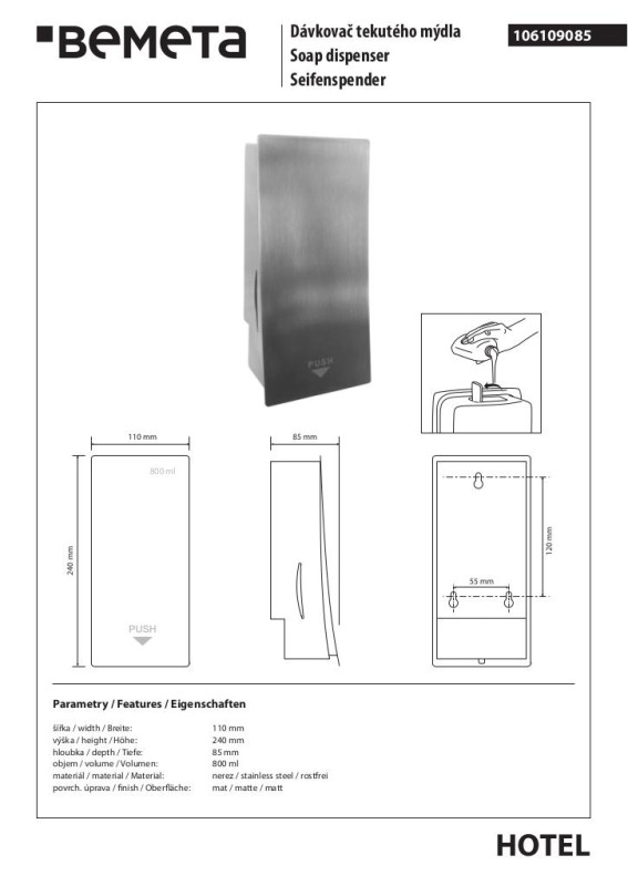 Диспенсер для жидкого мыла Bemeta Hotel 800 мл нержавеющая сталь матовая 106109085