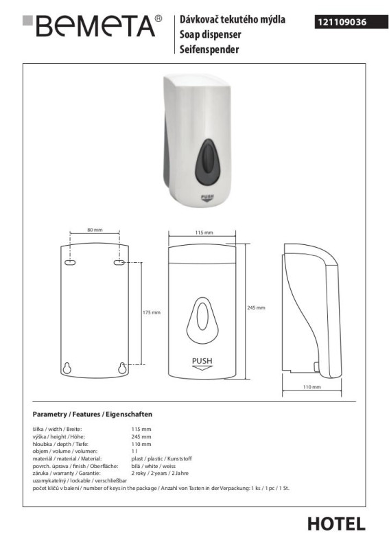 Диспенсер для жидкого мыла Bemeta Hotel 1000 мл пластик белый глянцевый 121109036