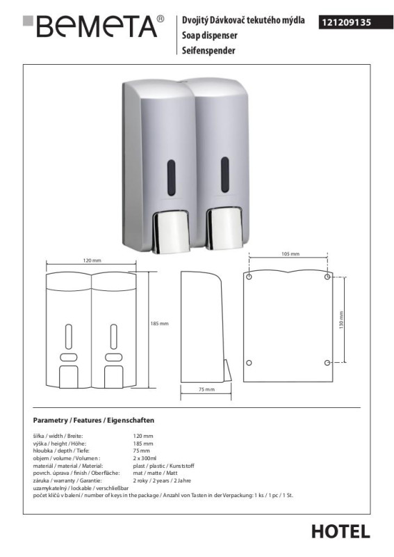 Диспенсер для жидкого мыла Bemeta Hotel двойной 2x300 мл пластик хром матовый 121209135