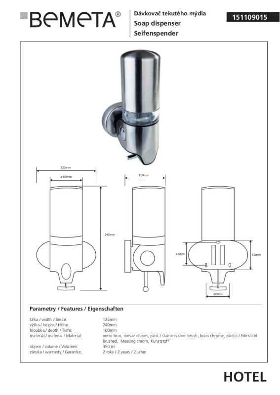 Диспенсер для жидкого мыла Bemeta Hotel 350 мл нержавеющая сталь хром матовый 151109015