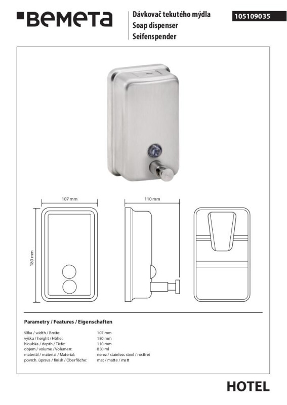 Диспенсер для жидкого мыла Bemeta Hotel 850 мл нержавеющая сталь матовая 105109035