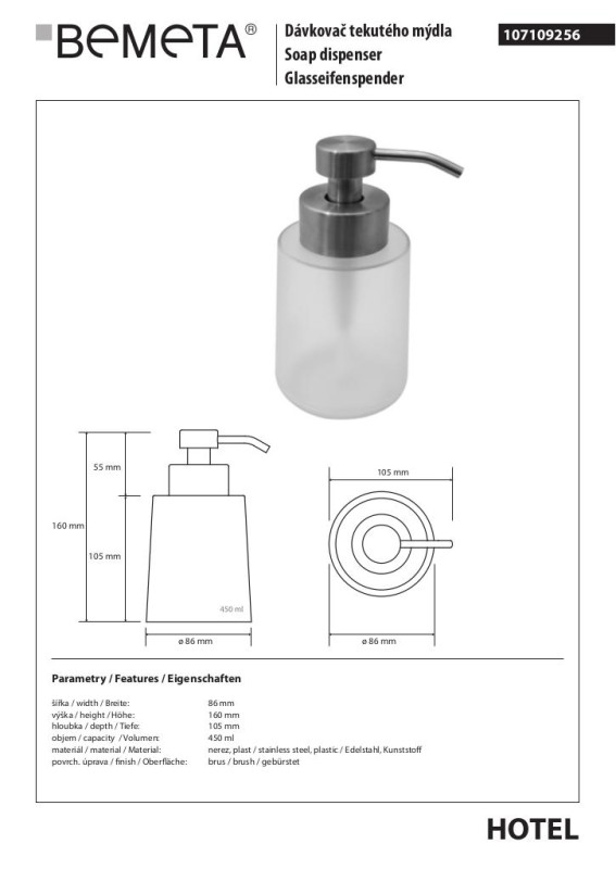 Диспенсер для жидкого мыла Bemeta Hotel 450 мл нержавеющая сталь матовая/пластик 107109256