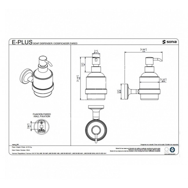 Диспенсер E-PLUS имеет средние размеры: 70х142х132 мм, что позволяет использовать его в комбинации с раковинами и мебелью для ванных комнат самых разных габаритов – от небольших до крупных. Эта модель дозатора для мыла предназначена для настенного монтажа, что более удобно, так как освобождает пространство раковины для других необходимых вещей или даёт возможность оставить её свободной и кристально чистой.