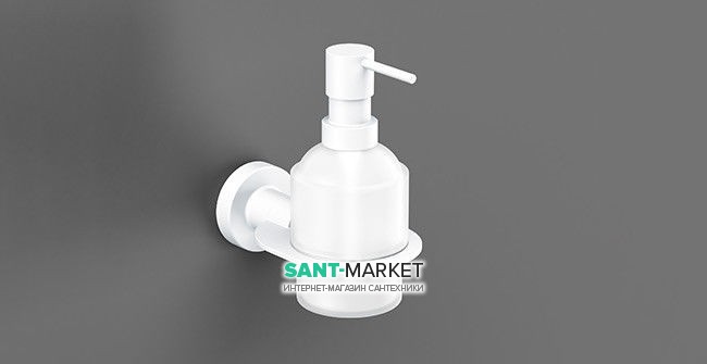 Белое основание дозатора и верхняя часть дополнены белоснежной ёмкостью для жидких средств гигиены. Гармонично впишется в интерьер большой и малогабаритной ванной комнаты. Не занимает много места, монтируется на стену.