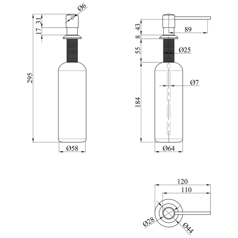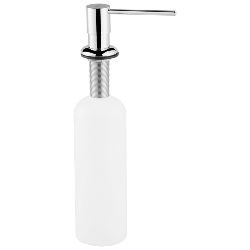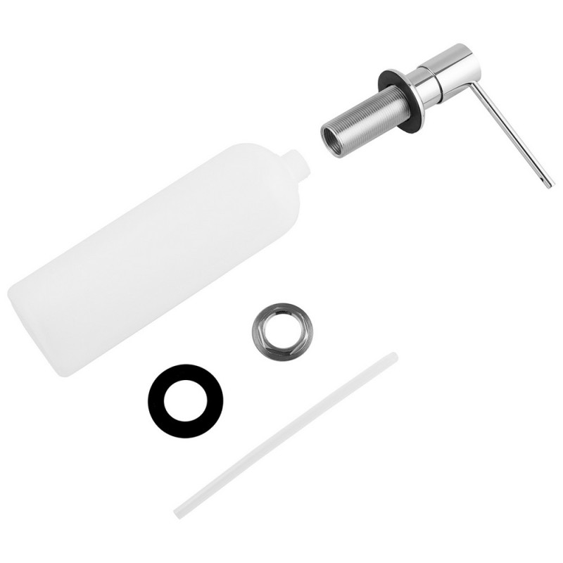 Он состоит из пластиковой емкости 500 мл, и помпы - из высококачественной латуни с хромированным покрытием, которая ее герметично закрывает. Оснащен системой подачи моющего средства с дополнительным каналом, исключающим контакт жидкости с латунными деталями. Аксессуар обладает повышенной прочностью, устойчив к агрессивному воздействию внешней среды и рассчитан на длительную эксплуатацию. Максимальная толщина столешницы 50 мм. Диаметр отверстия для установки 25 мм.