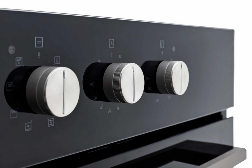 механические регуляторы, механический таймер, панель управления из черного стекла