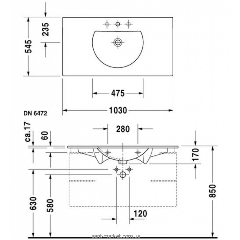 Керамический подвесной умывальник с возможностью установки на мебель с переливом и отверствием под смеситель в размере 1030х545мм, цвет белый.