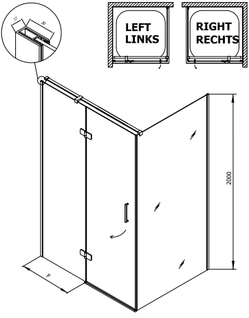 - Хромированные петли с функцией открытия вовнутрь или наружу +/- 90. Подходит для небольших ванных комнат, где полное открывание внутрь дает дополнительное пространство (в случае, если душевая кабина установлена на низкий поддон).