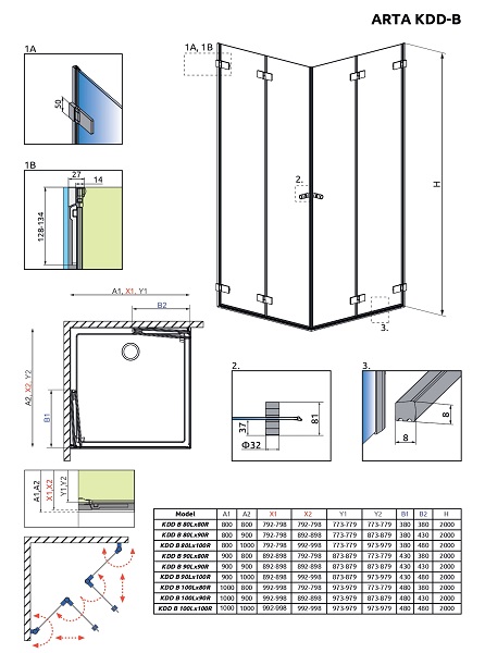 - для создания душевой кабины Radaway Arta KDD I необходима комбинация с левой частью 386160-03-01L, 386161-03-01L, 386162-03-01L