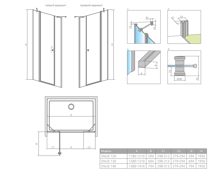 1) Душевая дверь Radaway Eos DWJS 130х195 см распашная левая хром/прозрачное стекло