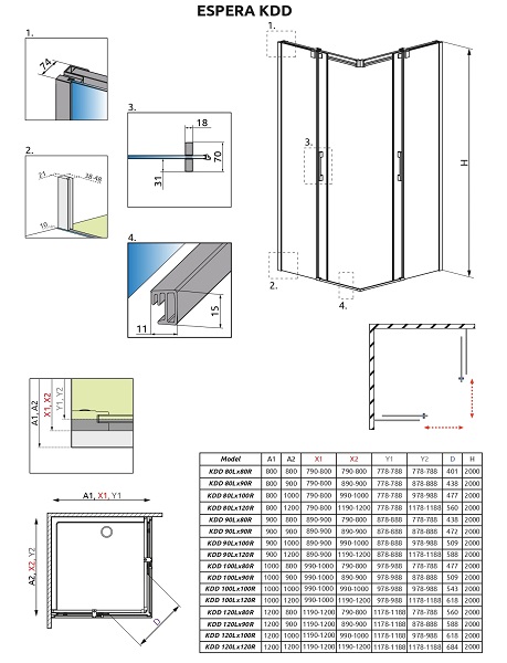 Espera KDD — квадратная или прямоугольная душевая кабина с двойной раздвижной дверью. Коллекция Espera это набор кабин и дверей в нишу которые отличаются надежностью и стилем. Espera создана для употребителей, которые точно знают чего хотят от жизни. Коллекция получила несколько призов от читателей разных журналов. Все изделия из этой коллекции допускается устанавливать как на поддон так и непосредственно на пол. Кроме того, все изделия допускается устанавливать с порогом или без порога меняя нижний фиксатор (в комплекте).