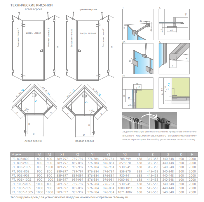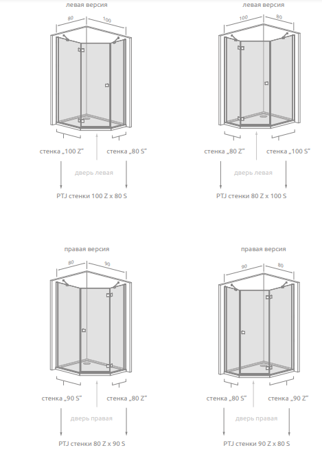 В заказе надо указать 2 номера артикулов: двери кабины и боковых стенок Z и S. Подсказка по формированию заказа на асимметричную кабину PTJ находится в технических рисунках.