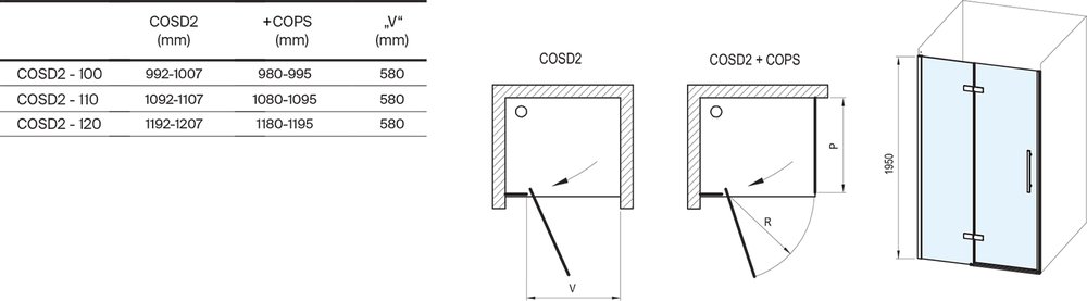 Повернув изделие на 180°, вы получаете возможность открытия двери влево или вправо. Изделие монтируется в кирпичную нишу, либо в сочетании с неподвижной стенкой COPS, на литые поддоны RAVAK Gigant, Gigant Pro, Gigant Pro Flat, Gigant Pro Chrome или непосредственно на пол со встроенным сливом или трапом в полу. Держатель входит в комплект. С помощью регулировочного профиля CONPS душевую дверь можно расширить на 25 мм (со стороны, где расположен магнит, и ее можно использовать только при установке в нише).