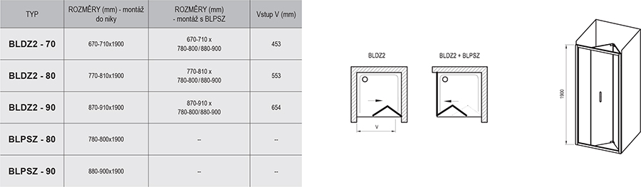 Продукт содержит одну неподвижную часть и одну подвижную часть, как дверь. Он монтируется в приготовленном углу ванной, комнаты на лотках RAVAK: Aneta, Angela, Perseus, Perseus Pro, Perseus Pro Flat, Perseus Pro Chrome, Gigant Pro, Gigant Pro Flat, Gigant Pro Chrome или непосредственно на пол с интегрированным блоком сливного или стоком в полу. Комбинации с двумя неподвижными стенками типа BLPS создает душевой уголок в форме „U“.