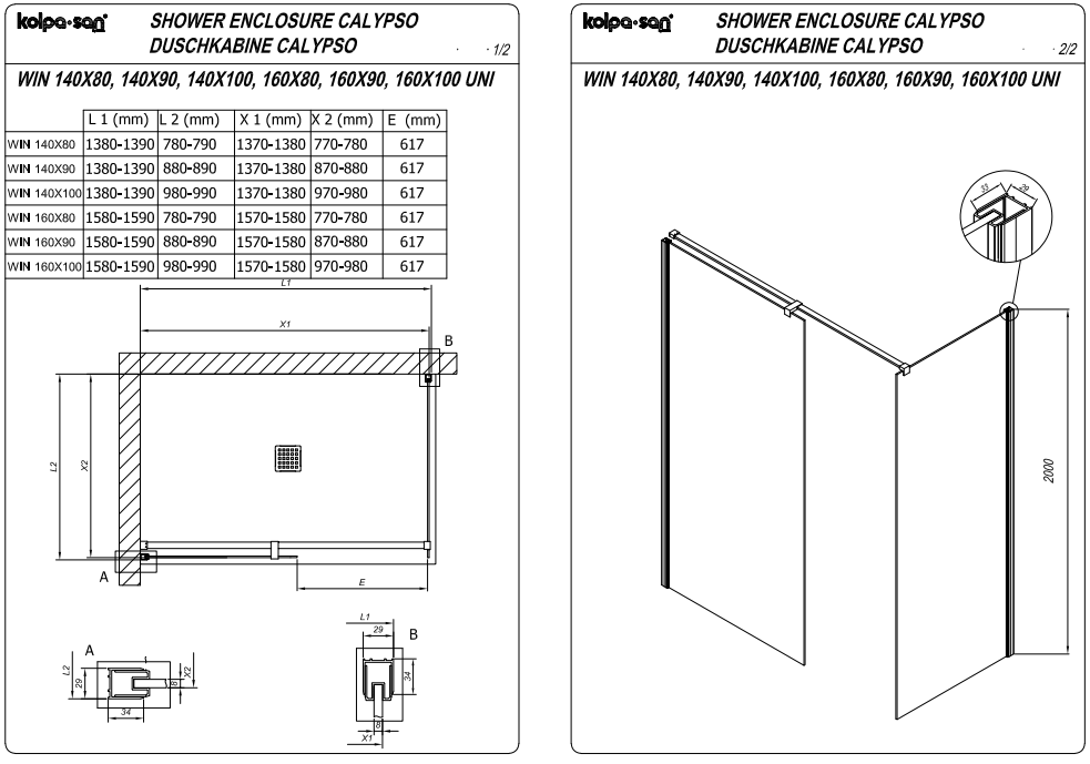 1) Душевая кабина Kolpa San Calypso WIN 160X80-UNI B профиль черный/прозрачное стекло Clean Coat