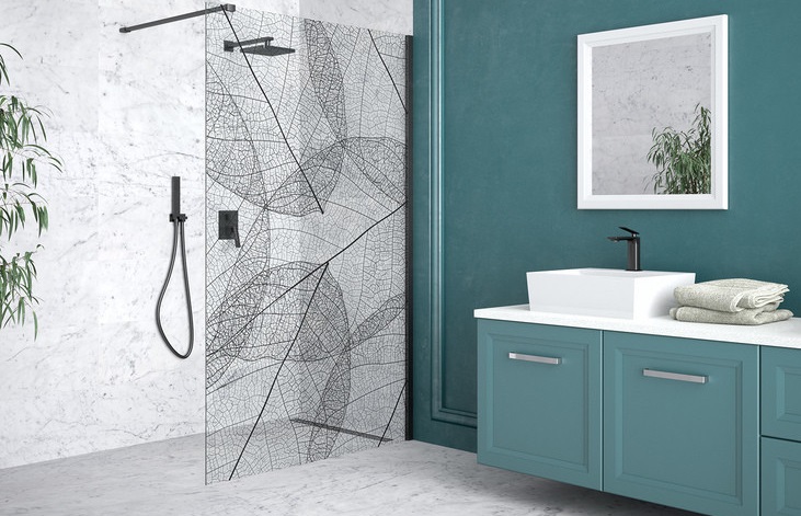 Душевая перегородка Besco Leafy Walk in 110х200 см профиль черный матовый/прозрачное стекло с узором