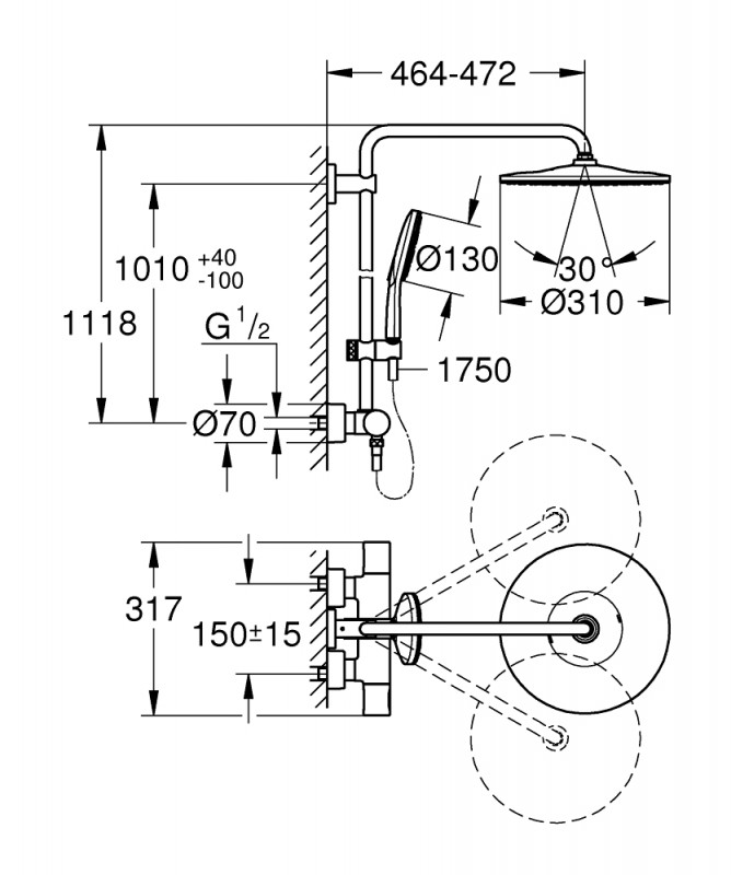 - душевой лейкой Rainshower Mono 310 (26562) с углом поворота поворотного шарнира ± 15°.