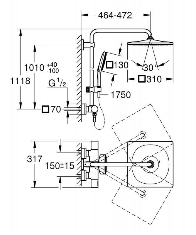 - душевой лейкой Rainshower Mono 310 (26568) с углом поворота поворотного шарнира ± 15 °