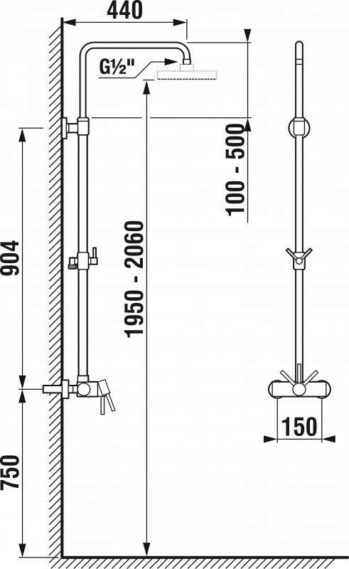 - При стандартном размещении на высоте 75 см от земли высота душа составляет от 180 до 220 см