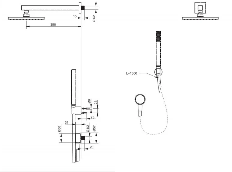 - Верхний душ: квадратный, 200х200 мм, с кронштейном