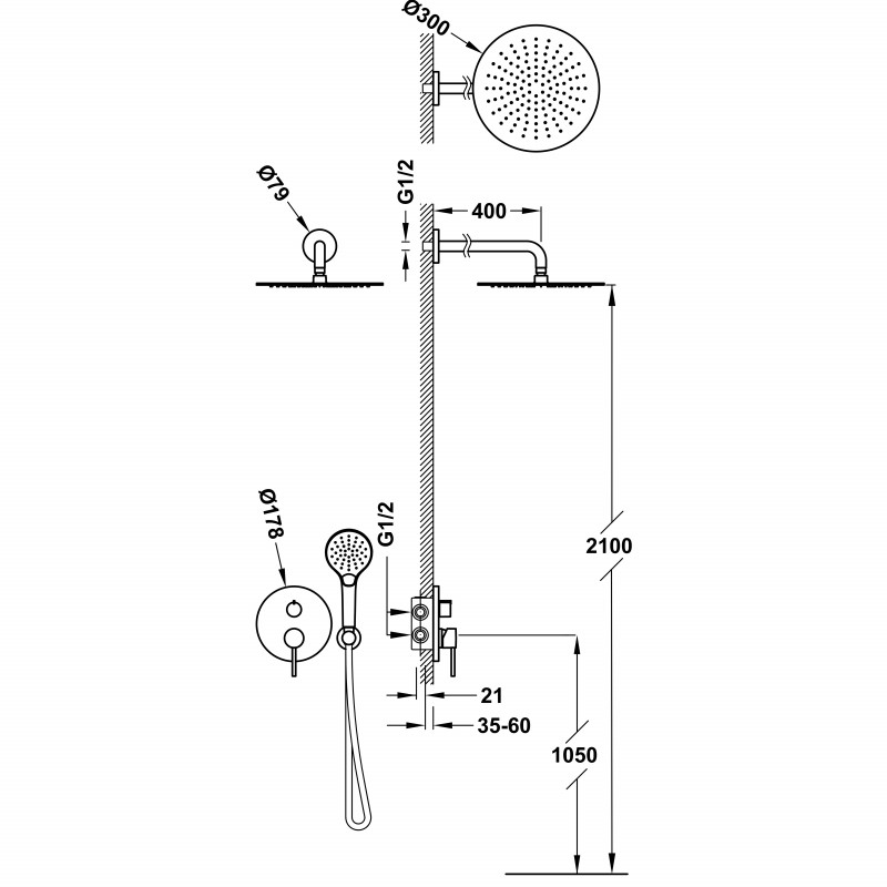 - Несъемный душ INOX Ø 300 мм с шарниром