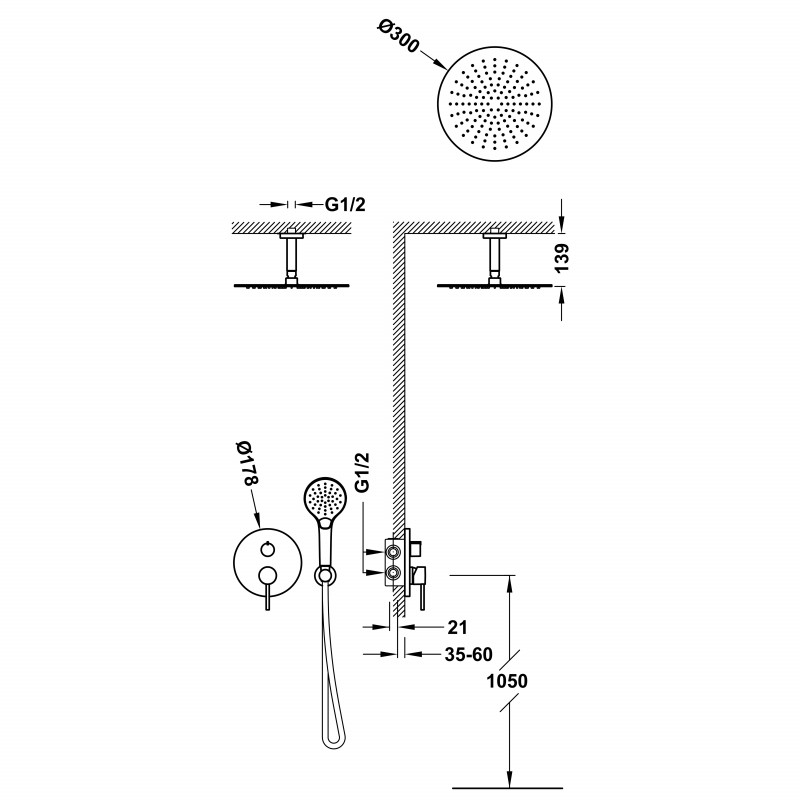 - Несъемный душ INOX Ø 300 мм с шарниром