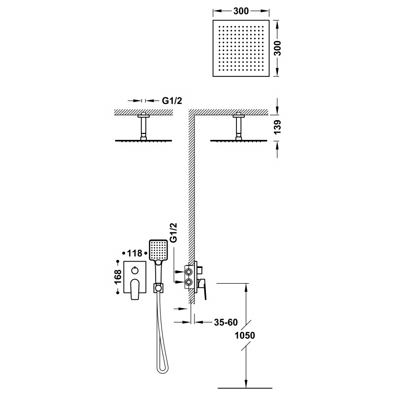 2) Несъемный душ INOX 300x300 мм с шарниром