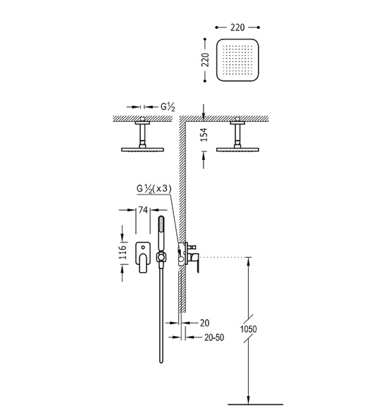- Несъемный душ 220х220 мм с шарниром