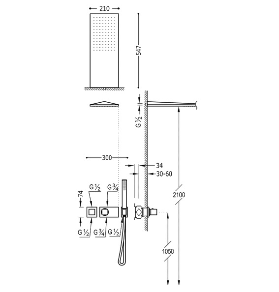 - Распылитель душевой INOX из нержавеющей стали настенный 210x547 мм.
