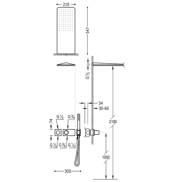 - Встроенная термостатическая система для душа с затвором и регулятором потока (2 канала)