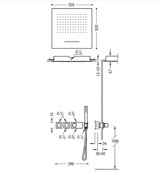 - Распылитель душевой INOX потолочный с 2 типами струи 500x500 мм