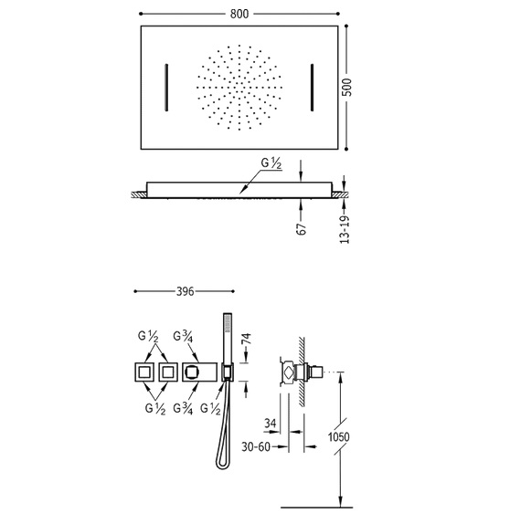 - Распылитель душевой INOX потолочный с 2 типов струи 500x800 мм