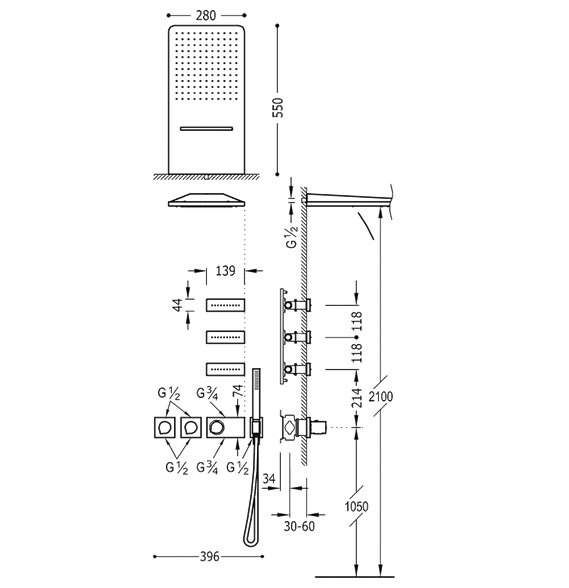 Душевая система Tres Block System термостатическая с верхним и ручным душем хром