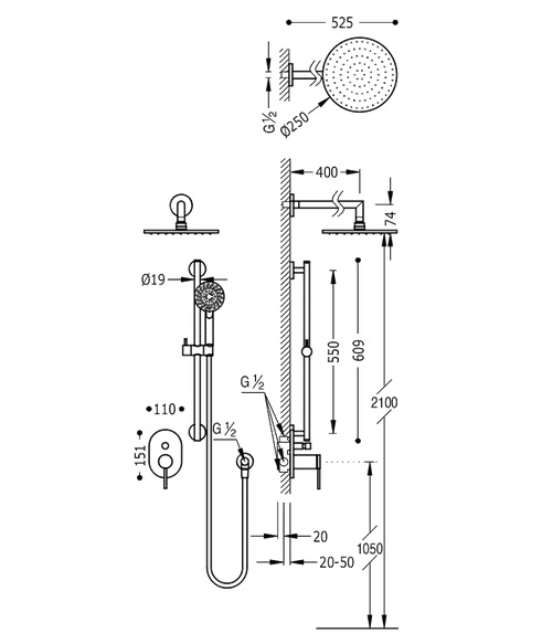 - Несъемный душ из латуни Ø 250 мм с шарниром