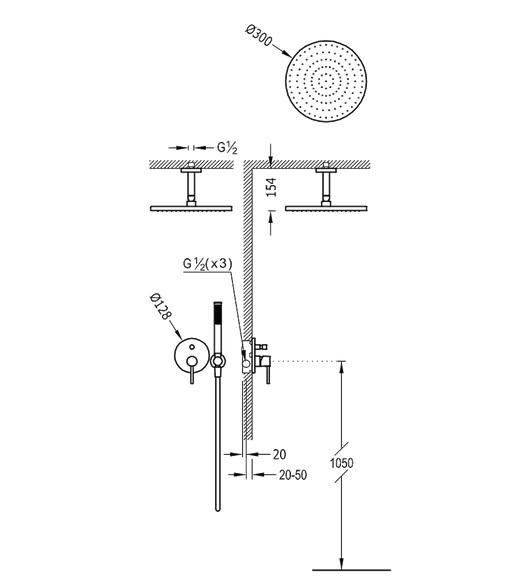 - Верхний душ Ø 300 мм с шарниром. Латунь.