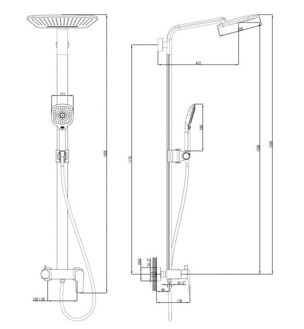 Комплектация: смеситель для душа, верхний душ, каскадный душ, душевой шланг, ручной душ, держатель для душа регулируется по вертикали и горизонтали