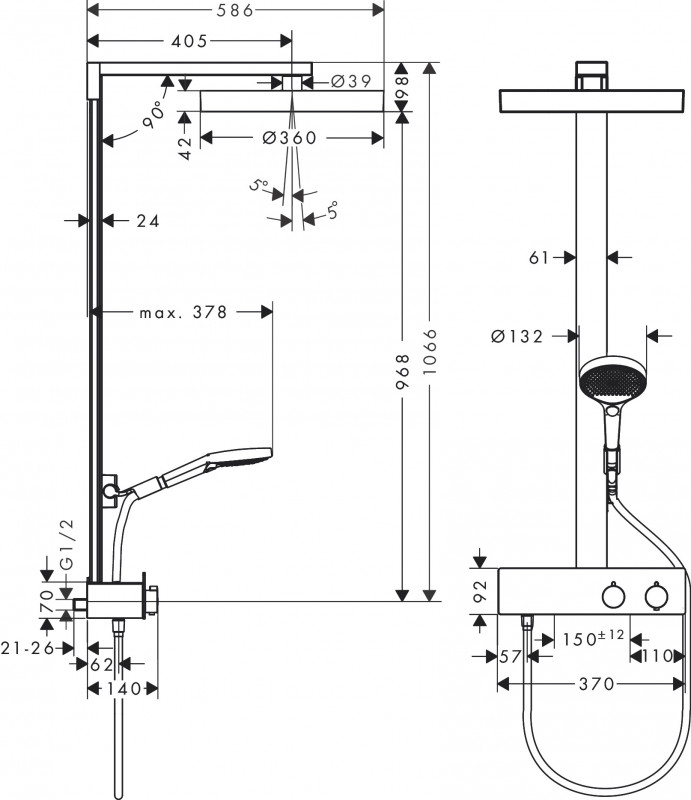 - Состоит из: верхний душ, ручной душ, термостат для душа, душевой шланг, держатель для ручного душа, штанга для душа