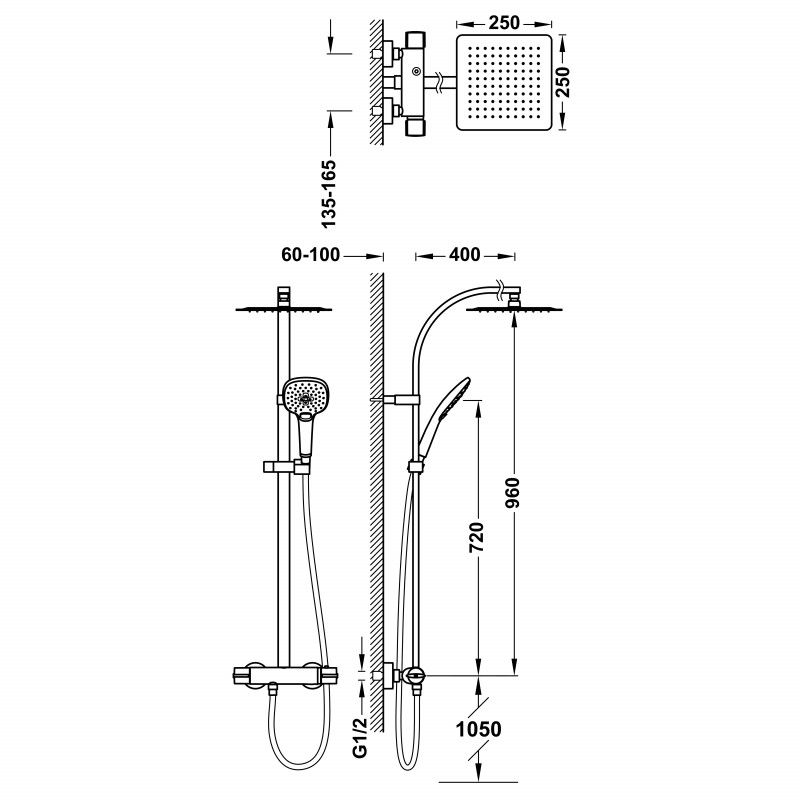 - Несъемный душ 250x250 мм с шарниром. Материал нержавеющая сталь