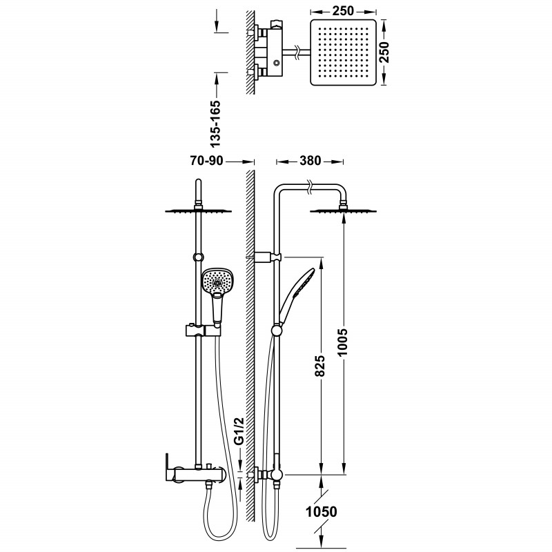 - Несъемный душ 250х250 мм с шарниром. Материал нержавеющая сталь