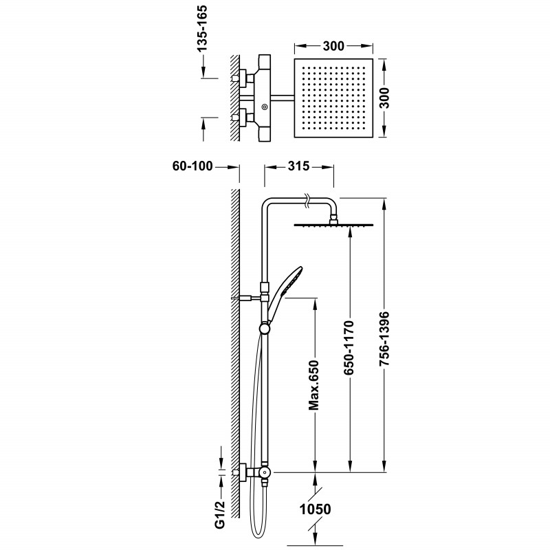 - Несъемный душ 300x300 мм с шарниром. Материал нержавеющая сталь