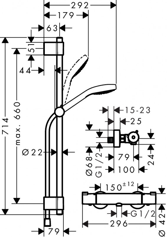- состоит из: ручной душ, термостат для душа, душевая штанга, держатель, шланг для душа
