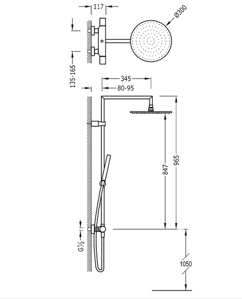 - Несъемный душ Ø 300 мм с шарниром. Латунь.