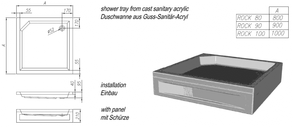 Квадратные душевые поддоны ROCK Kolpasan выпускаются несколькими вариантами линейных размеров, позволяя выбирать изделия 80х80, 90х90 или 100х100. Вариативность габаритов облегчает подбор моделей под величину ванной комнаты, делает покупку рациональнее.