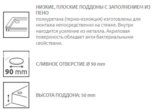 Низкие, плоские поддоны с заполнением из пенополиуретана (термо-излояция) изготовлены для монтажа непосредственно на стяжке. Внутри находится усиление из металла. Aкриловая поверхность обладает анти-бактериальными свойствами. Металлический каркас закрытый полиуретановой пеной гарантирует высокую прочность. С первого прикосновения создается осущение тепла. Поддон легко нагревается и медленно охлаждается. Легкий, быстрый и чистый монтаж (поддон достаточно горизонтально установить и приклеить клеем для плитки). Отверстие для сифона Ø90мм.
