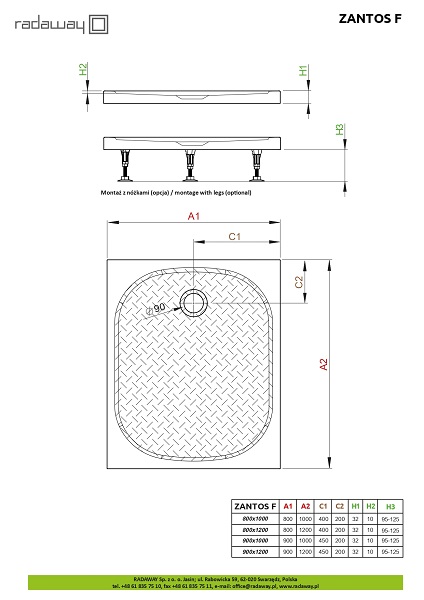 Душевой поддон Zantos F имеет прямоугольную форму с сливным отверстием диаметром 90 мм, противоскользящую поверхность и 100 % гидроизоляцию, которую обеспечивает гидроизоляционное полотно. Монтаж изделий данной серии осуществляется непосредственно на пол или на ножки.