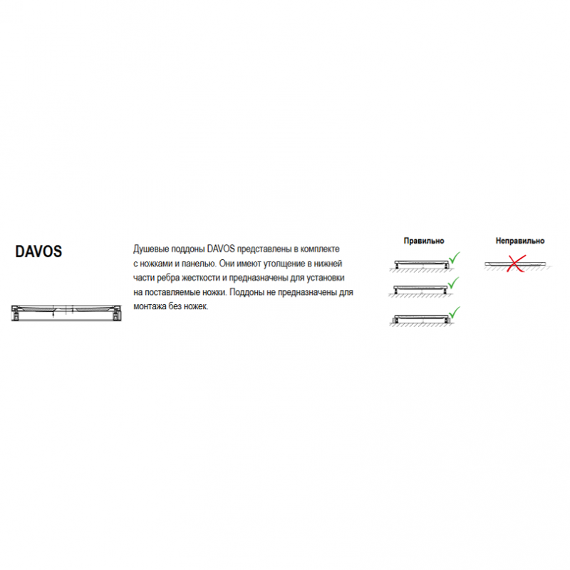 Душевые поддоны Riho Davos представлены в исполнении с ножками и панелью. Они имеют утолщение в нижней части ребра жесткости и предназначены для установки на поставляемые ножки. Поддоны не предназначены для монтажа без ножек.